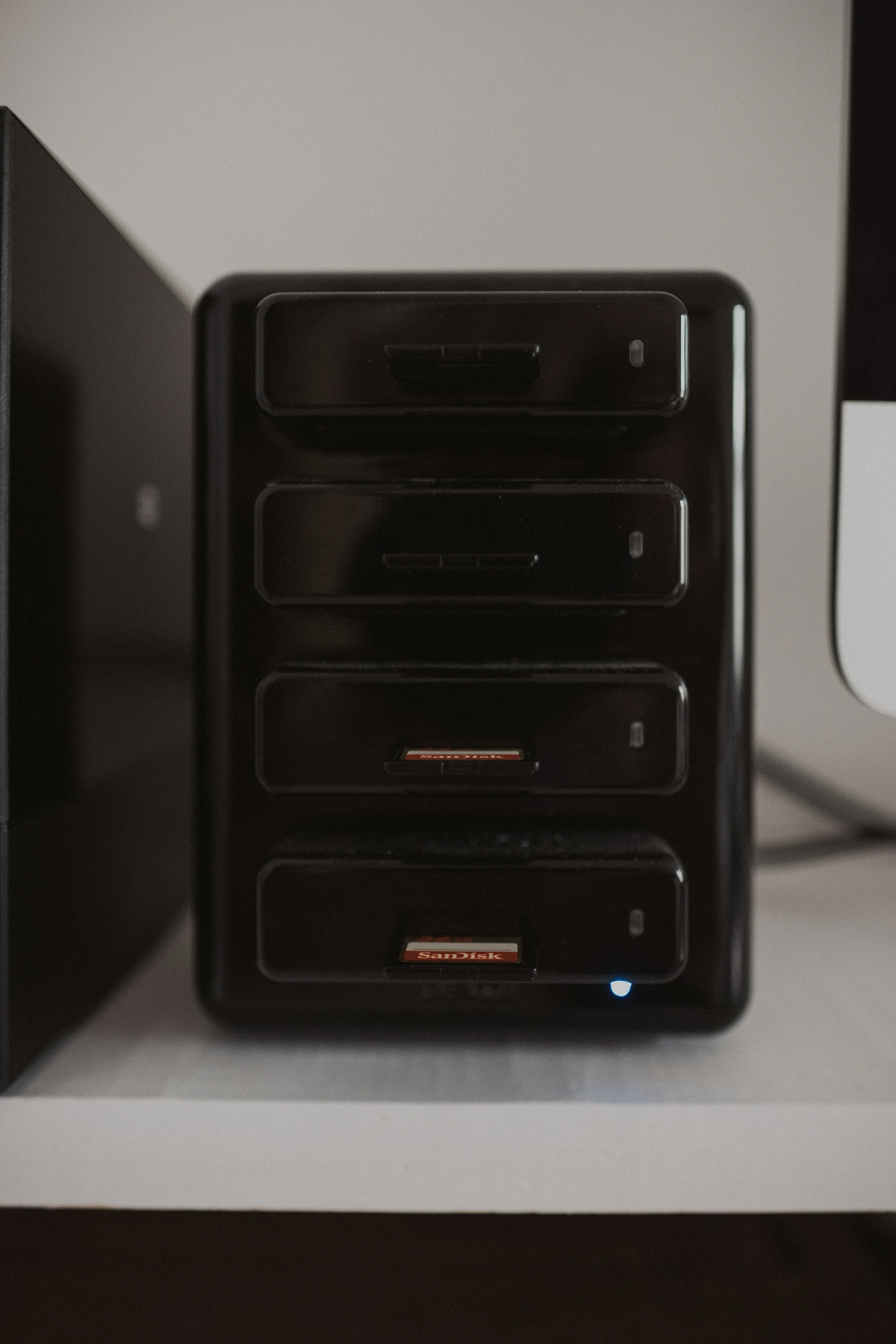 This is the Lexar Professional Workflow HR1 Four-Bay USB 3.0 Reader Hub right now it's about $50 on amazon, the beautiful thing about this is a hub and you can get different terminals for your use, I have mine set up with four SD card readers. You can even have it set up with a 512gb SSD if you're feeling extra.